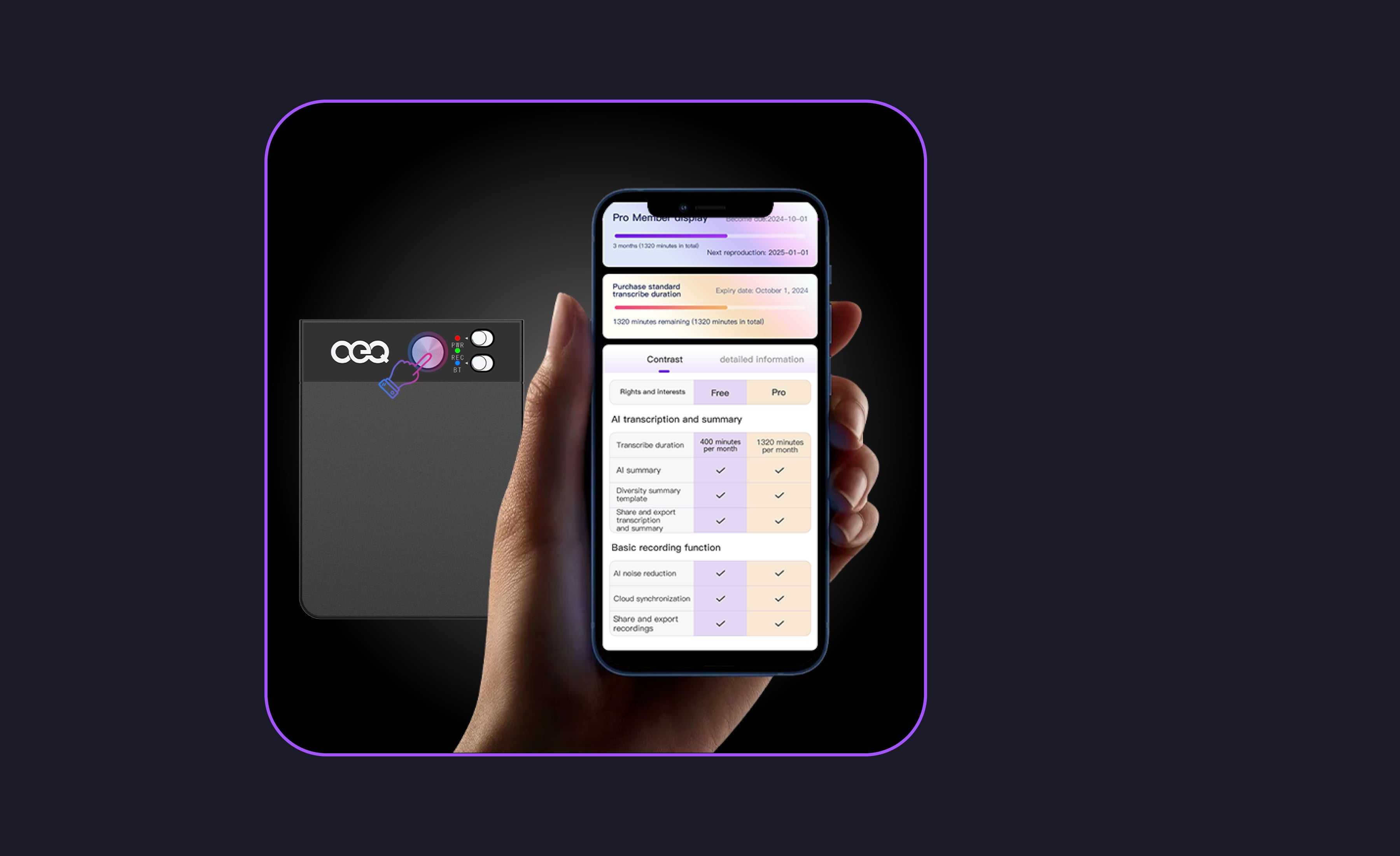 Unlock the full potential of OEQ AI voice recorder with three gifts: free 300 minutes/month of AI transcription, a free black magnetic case, and unlimited cloud storage.